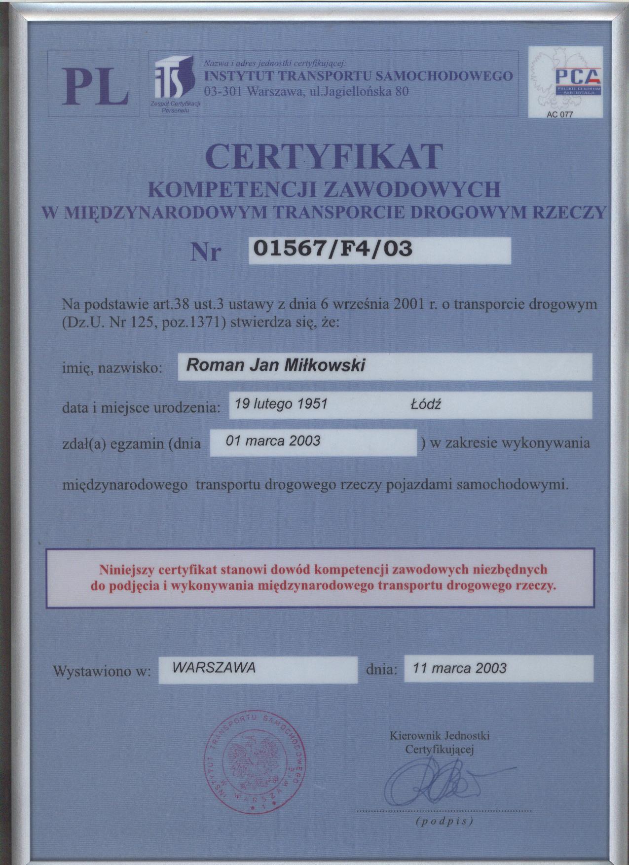 - CERTYFIKAT KOMPETENCJI ZAWODOWYCH ROMAN MIŁKOWSKI